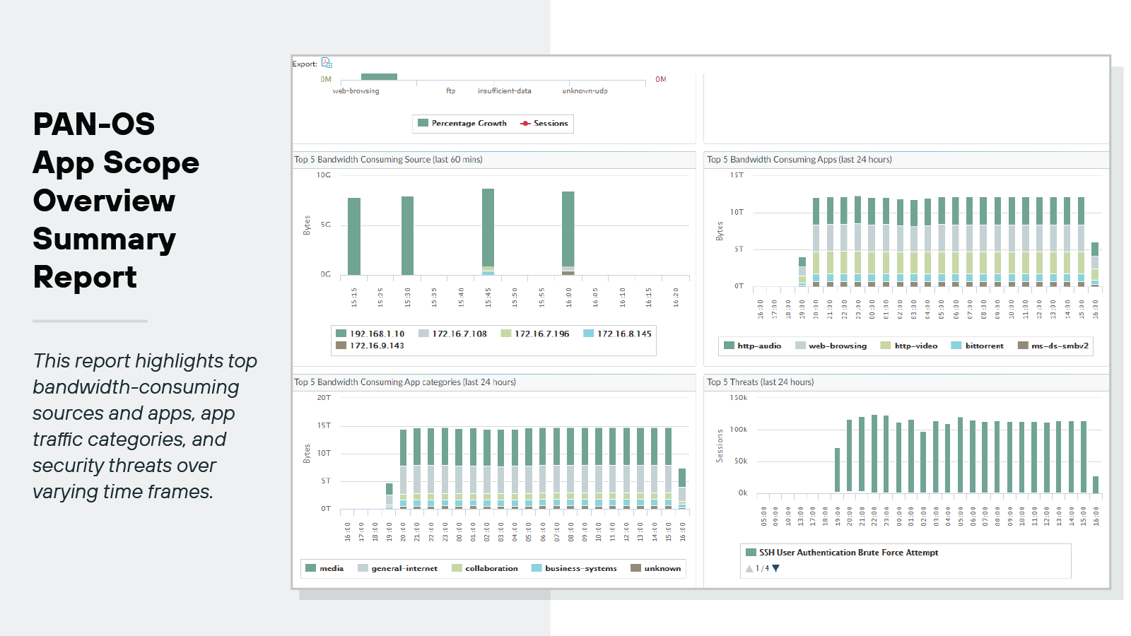 The Strata Cloud Manager Summary view provides a comprehensive view of network performance. Here, users can see real-time traffic, threats, and user activity so that admins can quickly identify and resolve performance issues.